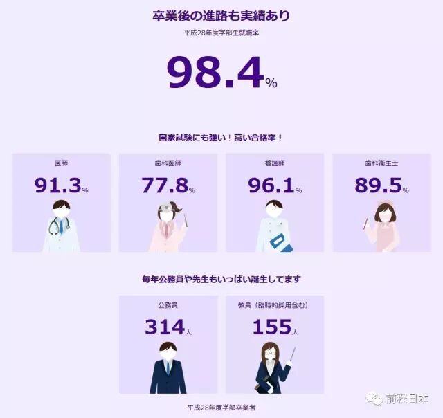 该校毕业生基本上在当地或者首都圈就职,综合就业率达到98.4%,就业竞争力可观。